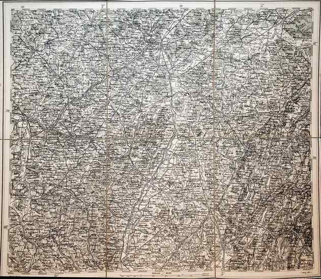 MACON [M?con]- [Blatt C. 8 der General-Karte von Central Europa 1:300000 1873-1876] Wien, Kaiserlich und K?nigliches Milit?r-Geographisches Institut, 1875. Heliogravure in Kupfer vervielf?ltigt durch Umdruck vom Steine., Blatt ca. 51x 45 cm, Kartenbild; ca. 48 x 42 zu 6 Segmenten auf Leinen aufgezogen; Zustand: sehr gut. Generalkarte von Zentraleuropa / Generalcarte von Centraleuropa / 1:300 000 / 1 : 300. 000. Die Generalkarte von Central Europa erschien in den Jahren 1873 bis 1876, sie ist das Werk von Joseph Ritter von Scheda (1815-1888) Nach seiner milit?rischen Ausbildung in Graz, wurde recht bald seine besonderen F?higkeiten f?r das Kartenzeichnen erkannt. Ab 1842 begann seine steile Karriere beim Wiener Milit?rgeographischen Institut. Zun?chst Leiter der Lithographischen Abteilung des Wiener Milit?rgeographischen Instituts sp?ter zeitweise auch der Kupferstichabteilung. War er ab 1869 Chef der Abteilungen Topographie, Lithographie und Kupferstich somit der gesamte Bereich der kartographischen Arbeiten des Instituts. Sein unerm?dliches Bestreben um Verbesserung der technischen und inhaltlichen Qualit?t der Karten trug er wesentlich zur Begr?ndung des Weltrufs des Wiener Milit?rgeographischen Instituts bei. Der hier angebotenen Karte gingen folgende Arbeiten voraus: 1845-47 General-Karte von Europa in 25 Bl?ttern Lithographie, General-Karte des ?sterreich. Kaiserstaates mit einem grossen Theile der angr?nzenden L?nder 20 Blatt in Kupferstich 1: 576 000, in der 2. Auflage 1870-1871 General-Karte von Central-Europa in 47 Bl?ttern, wobei diese Kartenwerke nach eigenen Zeichnungen Schedas im Institut auf seine Kosten produziert wurden. Wegen der hervorragenden Qualit?t wurde konnte die 1 : 576 000 Karte auf dem Ma?stab 1 : 300 000 vergr??ert werden, wodurch mit einem Schlage 207 Bl?tter der Generalkarte vorlagen. Vgl. ADB 53, S. 737 f. / NDB, 22, S. 598 f. / ?BL 10, S. 56 f. / Die Amtliche Kartographie ?sterreichs Wien 1970, S. 28, dieses Kartenwerk blieb bis zu der Generalkarte von Mitteleuropa 1: 200 000 Wien, k. k. milit?rg. Inst 1889-1912 der Standard.