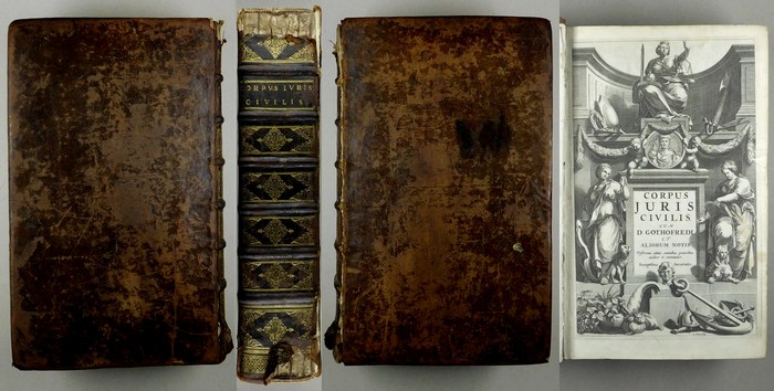 Corpus juris pandectis ... cum notis integris Dionysii Gothofredi. Huic editioni nove accesserunt ... Simonis van Leeuwen. Amsterdam, Johann Blaeu, Ludwig & Daniel Elzevier, Frans Hack., (1663). Folio. 10 Bl., 796 S.; 6 Bl., 388 S.; 6 Bl., 300 S., 92 S., 20 Bl. Index, mit einem gestoch. Vortitel von van Dalen. Lederband der Zeit mit goldgeprägtem Rückenschild und reicher Rückenvergoldung. Willems 1299. - Brunet III, 608. - "Peut-être le plus beau livre qui soit sorti des presses elzeviriennes d'Amsterdam. (...). Malgré la petitesse des caractères, malgré la grandeur de la justification, et malgré l'abondance des matières, ce livre se lit avec une grande facilité, et sans embaraas ni fatigue pour les yeux. Cette édition enfin est restée la plus belle de cet ouvrage" (Willems). - Rückenkanten angebrochen. Fehlstellen am oberen und unteren Kapital. Sauberes Exemplar. Stellenweise mit sauberen handschriftlichen Marginalien der Zeit. - Sonst auberes Exemplar.