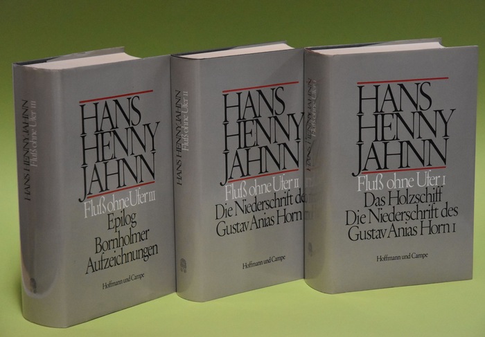 Werke in Einzelbänden: Teil: Fluss ohne Ufer: Roman in 3 Teilen. (Teile 1-3 vollständig) Hamburger Ausgabe Hamburg: Hoffmann und Campe 1986. 1. Aufl., 3 Bände 995+705+1044 S., 19 cm Gewebe. 0 Zustand: Pappeinband, sehr guter Zustand, mit Schutzumschlag (gering an den Kanten bestoßen), Lesebändchen --- Inhalt: Jahnns episches Hauptwerk, der dreiteilige Romanzyklus "Fluss ohne Ufer", entstand 1935 - 1947 auf Bornholm. Ursprünglich aus seinem Plan kürzerer Geschichten hervorgegangen, schrieb Jahnn zunächst das Holzschiff. Als sich eine Veröffentlichung in Deutschland zerschlug, entschloss er sich der Novelle ein abschließendes 10. Kapitel hinzuzufügen, aus dem dann die umfangreiche Niederschrift des Gustav Anias Horn in fast zehnjähriger Arbeit erwuchs. Ein geplanter dritter Teil, Epilog, der das Schicksal von Gustavs Mörder Ajax und seinem Sohn Nikolaj zum Inhalt habensollte, ist zwar im Manuskript weit gediehen, als Ganzes aber Fragment geblieben. Mit Bornholmer Aufzeichnungen und Erzählungen und Texte aus dem Umkreis von Fluss ohne Ufer im dritten Teil --- HZ2-3 ISBN: 9783455036329.
