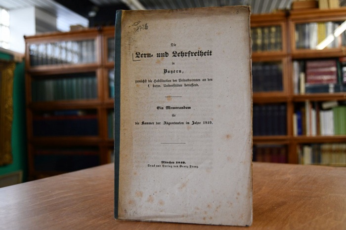 Die Lern- und Lehrfreiheit in Bayern, zunächst die Habilitation der Privatdocenten an den k. bayer. Universitäten betreffend. Ein Memorandum für die Kammer der Abgeordneten im Jahre 1849. München, Franz, 1849. 12 S. 23 x 15 cm, Broschur. Einband berieben, bestoßen, mit Einrissen, angeschmutzt, fleckig und gebräunt. Durchgehend fleckig. Sehr selten. Im KVK an keiner deutschen Bibliothek nachweisbar.