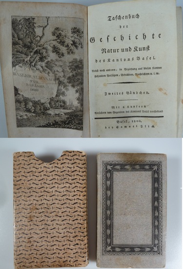 TASCHENBUCH DER GESCHICHTE, NATUR UND KUNST DES KANTONS BASEL ZWEITES BÄNDCHEN. Mit einem Frontispiz und 6 Falttafeln. Basel, Samuel Flick, 1800. 231 S., OPappband im Schuber. 12°. Deckel leicht braunfleckig. Wenig stockfleckig, sonst gut.