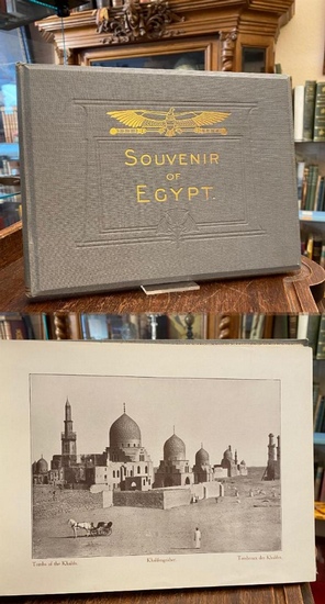 Souvenir of Egypt : 70 Illustrations of Lower and Upper Egypt. Including all the principal views of places of interest on the Nile. Bolton and London, Tillotson Press, [ca. 1900]. 4° oblong (20x27), title page and 55 plates with full and half page foto pictures, publisher's hardbound blue grey cloth (calico), gilt decorated, full edge gilt, floral endpapers,. tight and clean, well cared, captions in English, German and French.-.